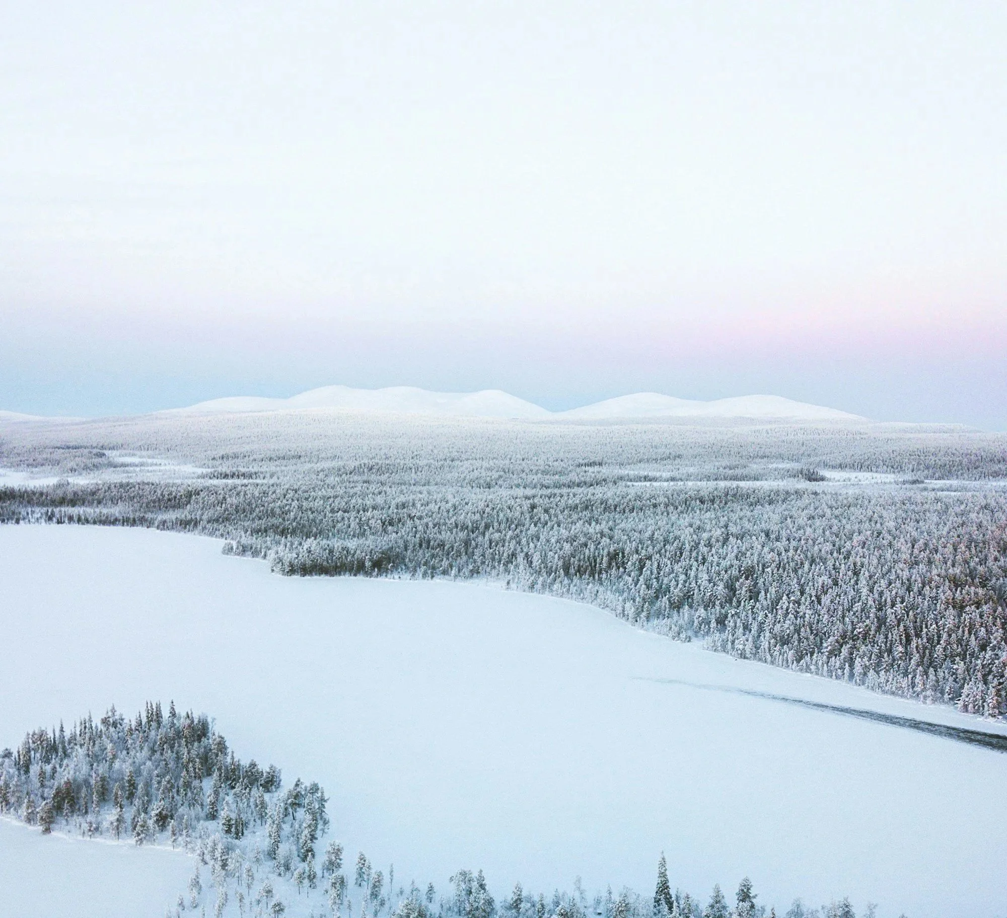 A snow-covered landscape with a frozen lake, dense forest, and distant mountains under a pale sky.